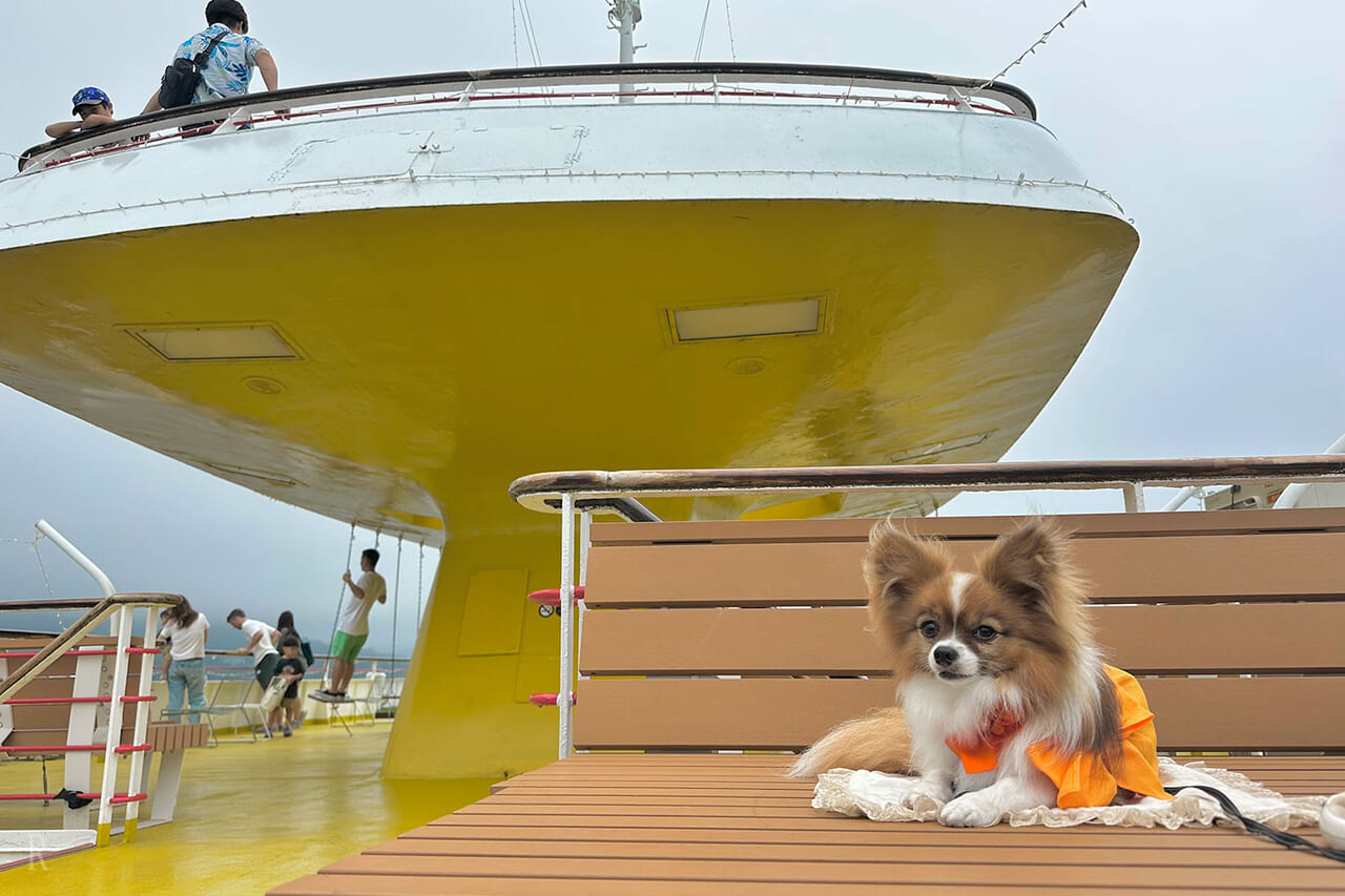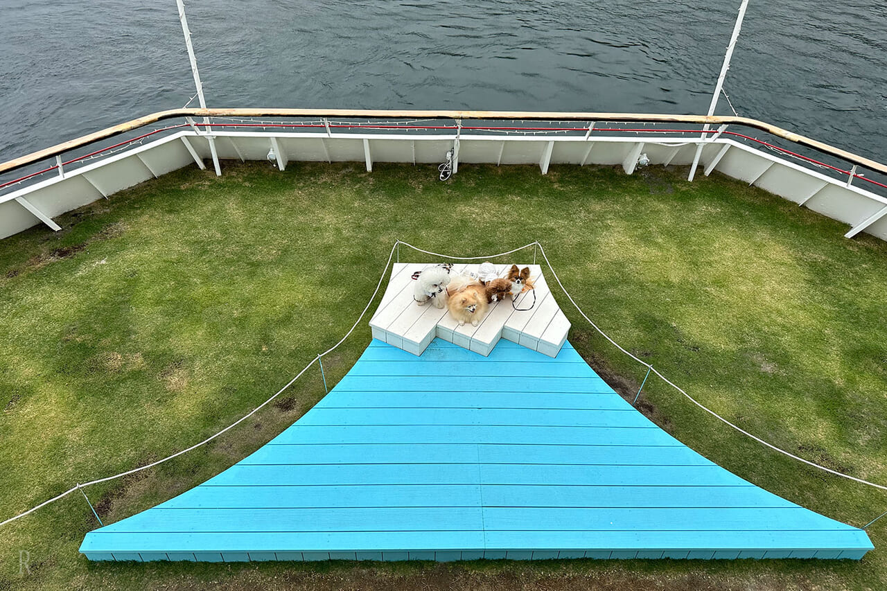 それが2024年に誕生した「箱根遊船SORAKAZE」です。“芦ノ湖に浮かぶ緑の公園”をコンセプトに作られたこの船は天然芝を敷き詰めたデッキや蔦を絡ませた船尾など自然を感じさせるデザインが印象的。しかも乗船&下船時と船内は全身を隠す必要がありますが、3、4階のデッキはリードウォークOKとわんちゃんにも優しいクルーズ船なのです!