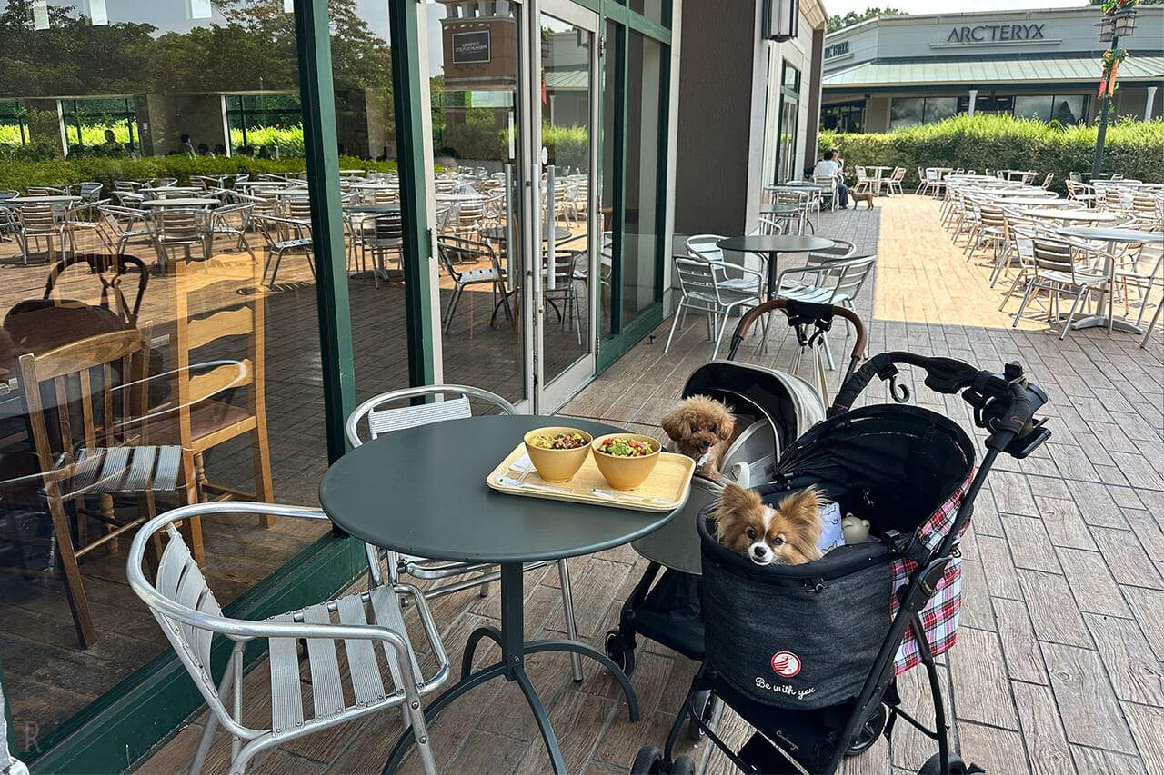 アウトレット内のフードコートや一部のレストランにはテラス席があり、ペットの同伴が可能です。店内への入店はできないので、オーダーする際は交代で行くなどの対応が必要ですが、ランチやカフェタイムも一緒に過ごせるのは魅力。フードコートの一部は日陰になっていて涼しく過ごせました!