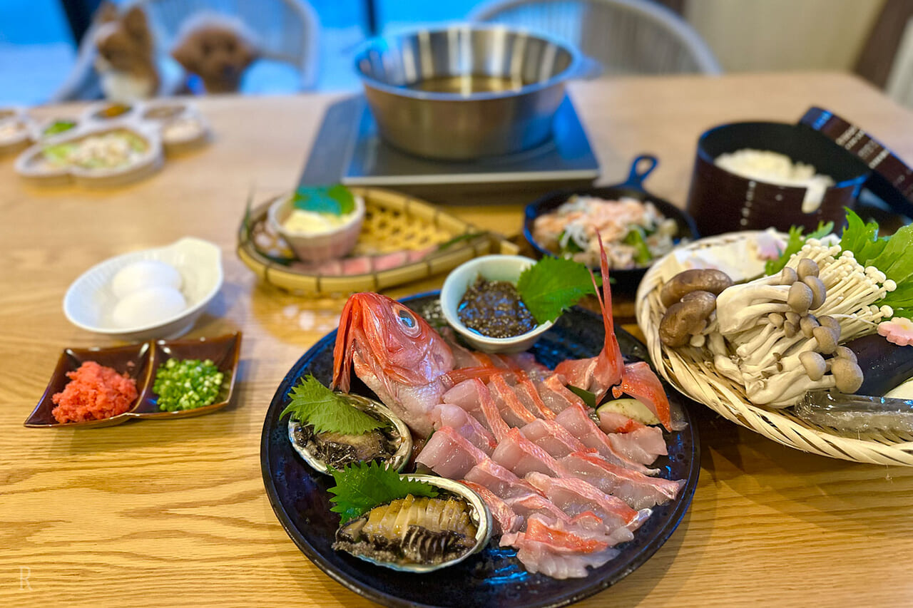 今回は「金目鯛と鮑のしゃぶしゃぶ」をピックアップ。お刺身でも食べられるほど新鮮な金目鯛と鮑を贅沢に楽しめる大人気のメニューです。メインのしゃぶしゃぶのほかに、桜エビとしらすのアヒージョや相州牛のたたき・生湯葉・しらすの沖漬けなどサイドメニューも充実していてボリューム満点。おひつで提供されるご飯はそのままでももちろん美味しく召し上がれますが、お出汁がたっぷり出たお鍋の〆の雑炊は絶品です。